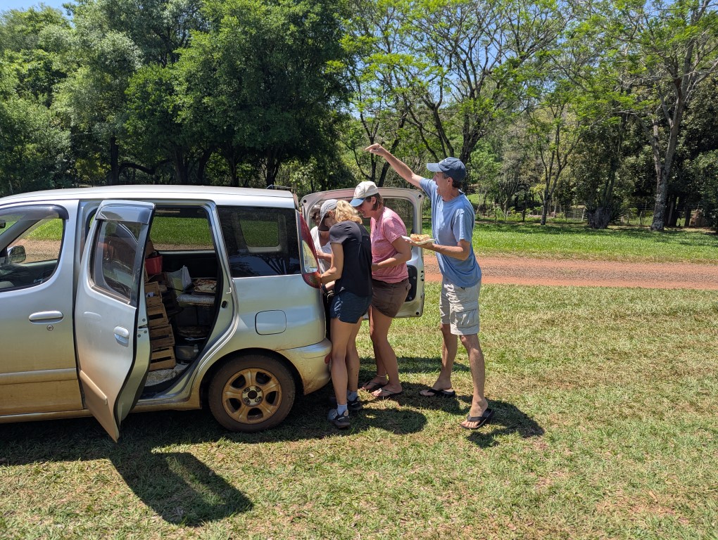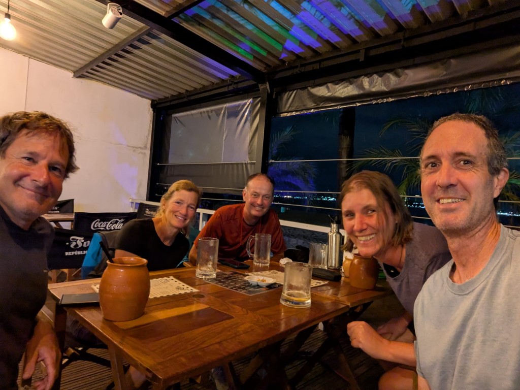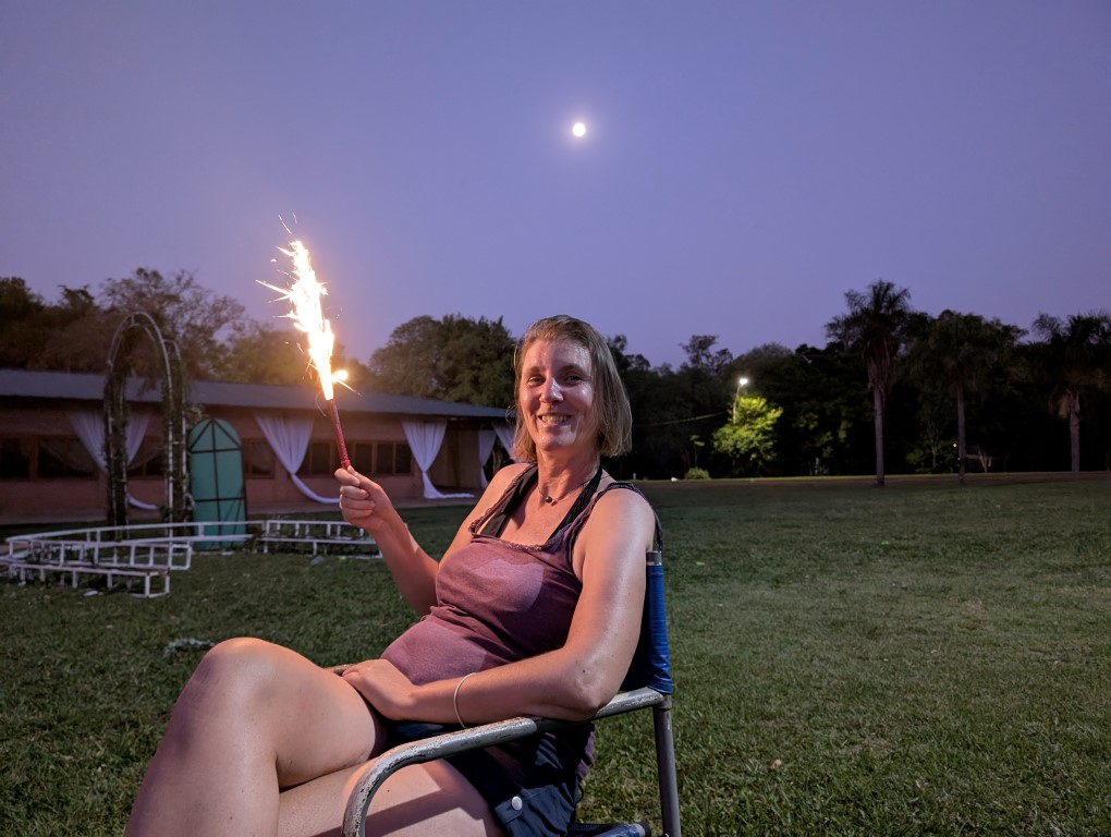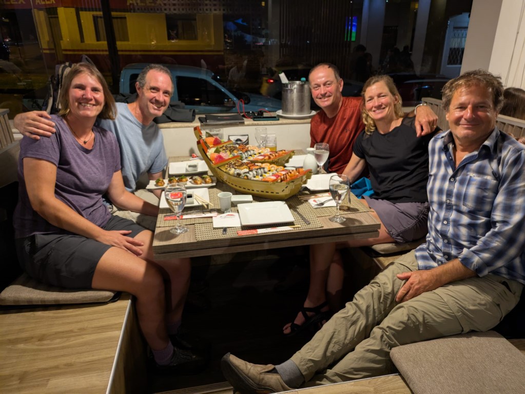Shortly after arriving and meeting up with Mark, Liesbet and their Aussie friend Larry in an awesome resort style farm, hotel & campground, it was Jon’s birthday. It started out with a birthday breakfast, a nice walk on the beautiful grounds here at Manantial, an afternoon going into the city of Encarnacion in a rainshower to visit an Asian food store (lots of Japanese & Germans live in Paraguay), then a riverfront beach walk once the rain stopped. Watched the sunset, had a beer and then went out for sushi at a really nice restaurant!!! We’d been so looking forward to a big sushi boat and then there we were with great company! Then we came back for cake & champagne. It was such a great day.