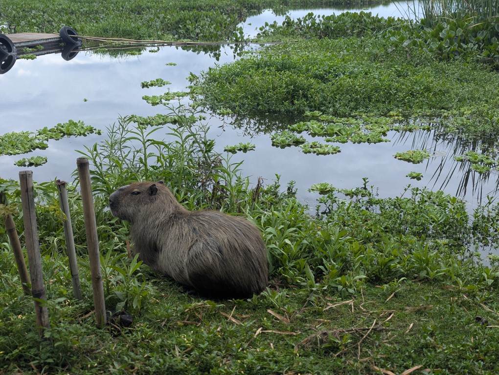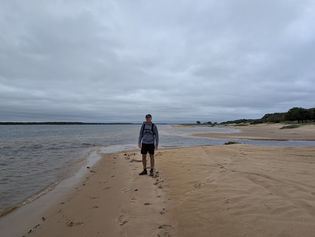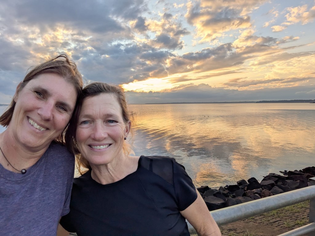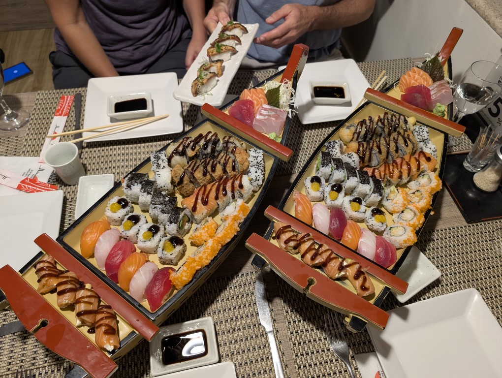 Shortly after arriving and meeting up with Mark, Liesbet and their Aussie friend Larry in an awesome resort style farm, hotel & campground, it was Jon’s birthday. It started out with a birthday breakfast, a nice walk on the beautiful grounds here at Manantial, an afternoon going into the city of Encarnacion in a rainshower to visit an Asian food store (lots of Japanese & Germans live in Paraguay), then a riverfront beach walk once the rain stopped. Watched the sunset, had a beer and then went out for sushi at a really nice restaurant!!! We’d been so looking forward to a big sushi boat and then there we were with great company! Then we came back for cake & champagne. It was such a great day.