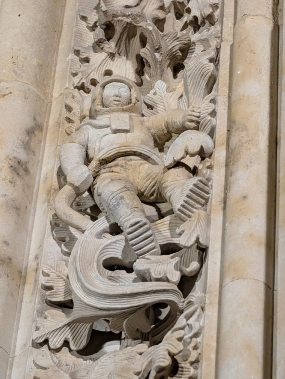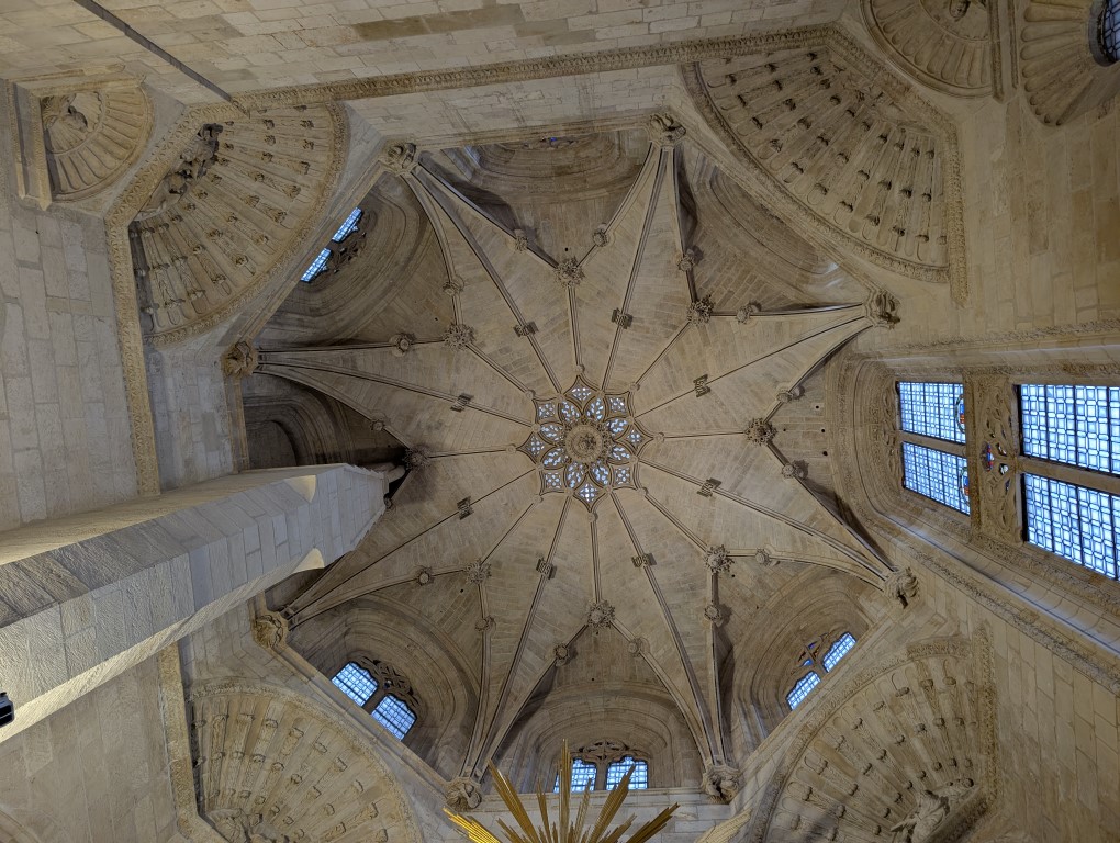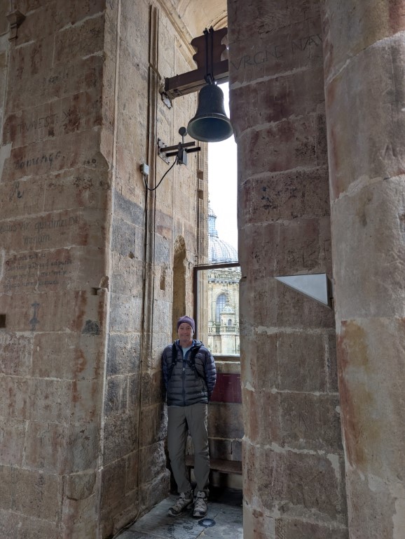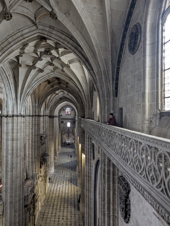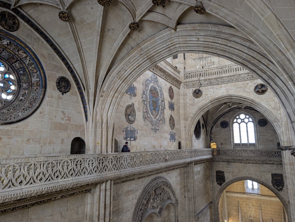 We walked back in to town the following morning and spent another day strolling around Salamanca and ended up at the lovely cathedral tower. You can go up into the tower and then walk all over the upper parts of the cathedrals (both old & “new” because they are connected) on catwalks- it is fantastic! You know when you’re in a huge cathedral and you see that upper walkway that goes around and wonder who gets to go up there? Well it is you that is up there on this tower visit. And even better is to go up onto the roof above the top of the ceiling of the cathedral. There is a catwalk up there that shows a video of what you would be seeing if you looked straight down through the ceiling, hard to explain. This is among our favorite things we’ve done as far as historic European buildings go, hands down.