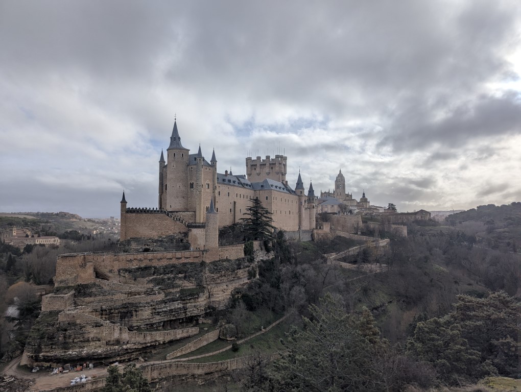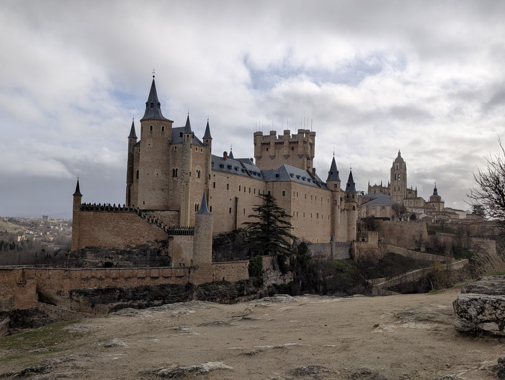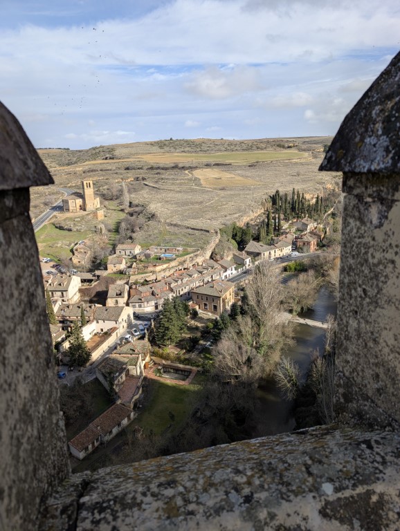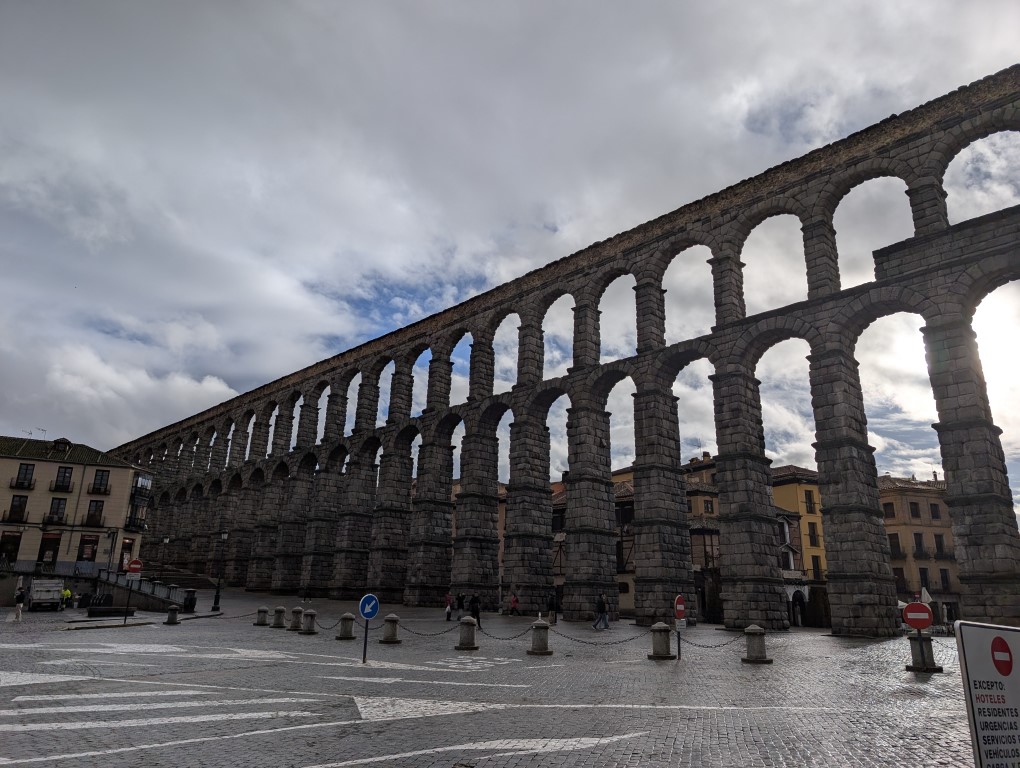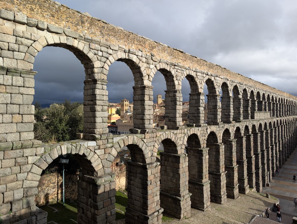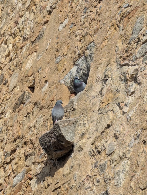 We headed to Segovia with it’s beautiful Roman Aqueduct. This aqueduct has 167 arches and brings water first 13 km under ground, then up onto a wall and then up onto the top of the arches to travel through the city, then down underground again before being channeled to the western corner where the beautiful castle sits- the Alcazar. This castle inspired Walt Disney, and it really is beautiful. We REALLY liked the city because not only is it walled, but it has a ring of quiet green trails around it. We had good weather that morning and walked all over, then toured the castle. On the plaza in front, the storks live in the trees and are a part of the scene. Their clacky call is as much a part of the history tales as it is a part for everyone visiting today. I like this kind of thing, it cracks me up. In fact, in this part of Spain and much of Portugal, the storks live in communes perched on huge nests atop power lines, they really love church roofs, big trees etc and they feed in the agricultural fields nearby. Then, of course you have the pigeons living in the castle walls.