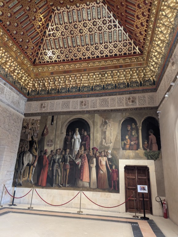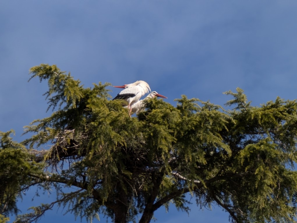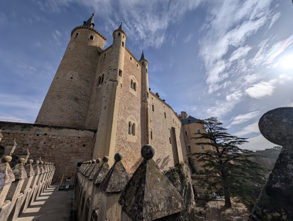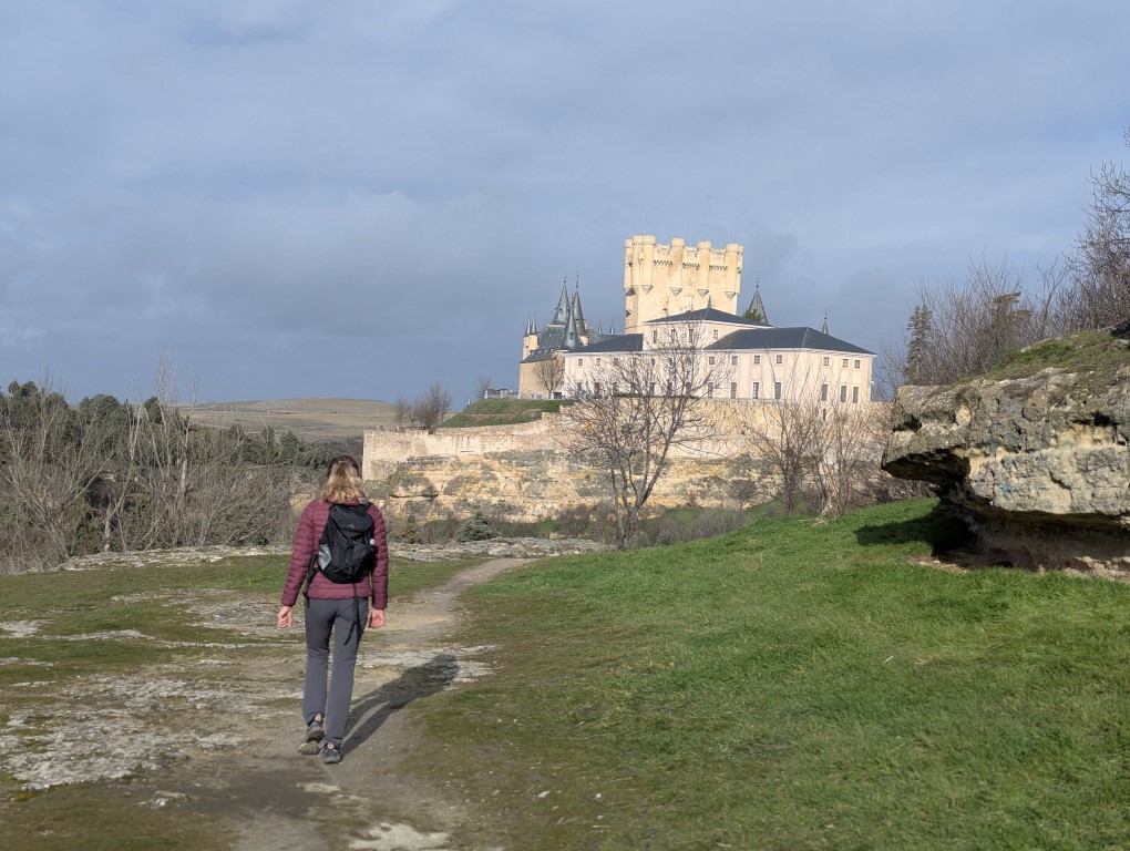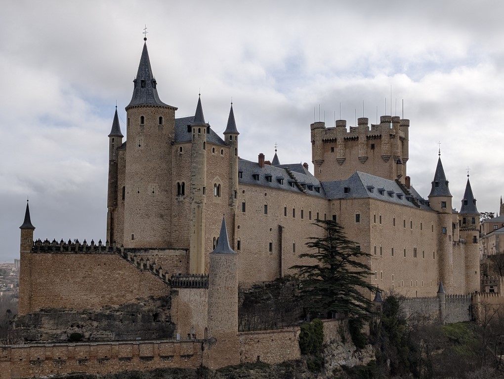 We headed to Segovia with it’s beautiful Roman Aqueduct. This aqueduct has 167 arches and brings water first 13 km under ground, then up onto a wall and then up onto the top of the arches to travel through the city, then down underground again before being channeled to the western corner where the beautiful castle sits- the Alcazar. This castle inspired Walt Disney, and it really is beautiful. We REALLY liked the city because not only is it walled, but it has a ring of quiet green trails around it. We had good weather that morning and walked all over, then toured the castle. On the plaza in front, the storks live in the trees and are a part of the scene. Their clacky call is as much a part of the history tales as it is a part for everyone visiting today. I like this kind of thing, it cracks me up. In fact, in this part of Spain and much of Portugal, the storks live in communes perched on huge nests atop power lines, they really love church roofs, big trees etc and they feed in the agricultural fields nearby. Then, of course you have the pigeons living in the castle walls.