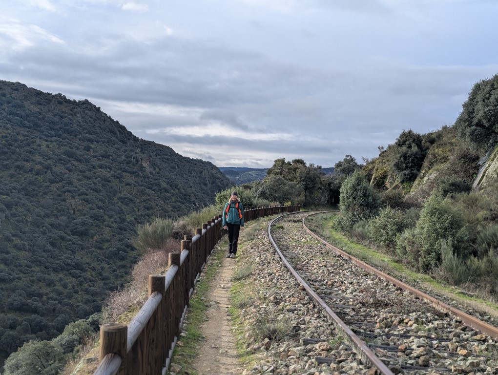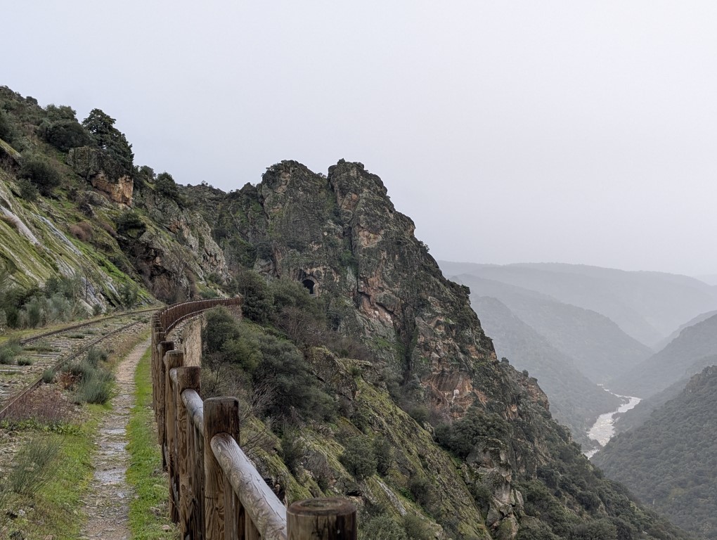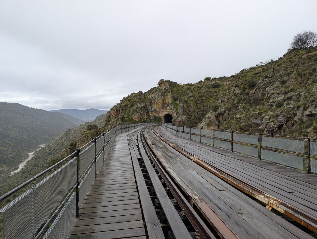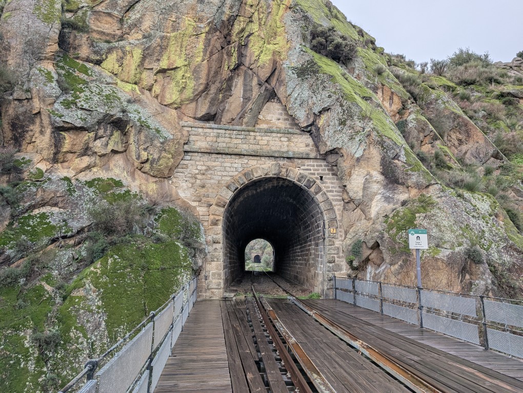 It was time for some long walking days. We drove westward from Salamanca through the beautiful Duero River Valley full of wineries and positioned ourselves at the start of the Camino de Hierro historic rail trail on the Portugal border. It was a beautiful spot and we could park in the parking lot of the park visitor center overnight. This elaborately built railroad used to carry Port wine from Porto, Portugal to Salamanca and then carry back grains to Porto. It covers challenging terrain and this 17km section has 20 tunnels and 10 bridges. The tracks are still in place but there is a rough path beside them and its now a walking trail. Park staff transport you to the start of the trail and you walk back to your vehicle. The first tunnel is 1.5km long so this is what you see- the light at the end of the tunnel. They give you a flashlight to make your way through, then you come out to great views, a river, cliffs, waterfalls, cactus, huge bridges, more tunnels and miles of peace.