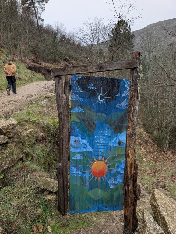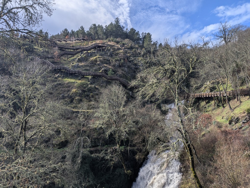 We worked our way up into the mountains of central Portugal on small roads to do another boardwalk outside the town of Arouca, the Passadicos do Paiva. Traveling those roads, we got a little nervous at times because we could see flood damage and toppled trees from the near constant storms that keep affecting Spain & Portugal and the rain continued to fall. We can’t even the see the banks of most rivers wherever we go because the water is so far over them. In one little town we visited and went out to lunch, the locals were streaming in to warm themselves by the fireplace and have a coffee. The owner told us that many had damaged roofs from all the wind & rain. We can see how hard the road crews are working to keep everything together. The people have been very kind and we like Portugal. However, the architectural style doesn’t move us the way Spain & France do.